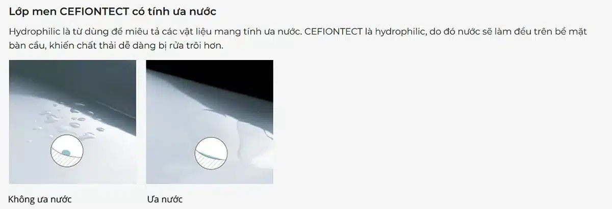 Một trong những điểm yếu của bàn cầu thường là các vết ố vàng do nước đọng. Công nghệ CEFIONTECT giúp bề mặt sứ trở nên ưa nước. Khi xả, nước sẽ lan tỏa đều và len lỏi vào giữa lớp men và chất bẩn, dễ dàng nâng bổng và cuốn trôi mọi tạp chất.