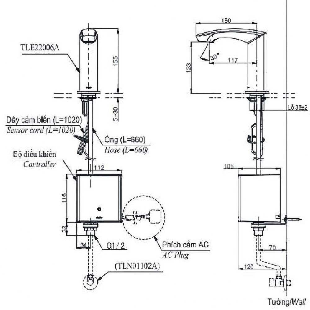 Bộ điều khiển vòi cảm ứng TOTO TLE01502V/ TLN01103A/ TLE05701A nóng lạnh, dùng điện (Kèm dây cấp – van dừng và van nhiệt độ)