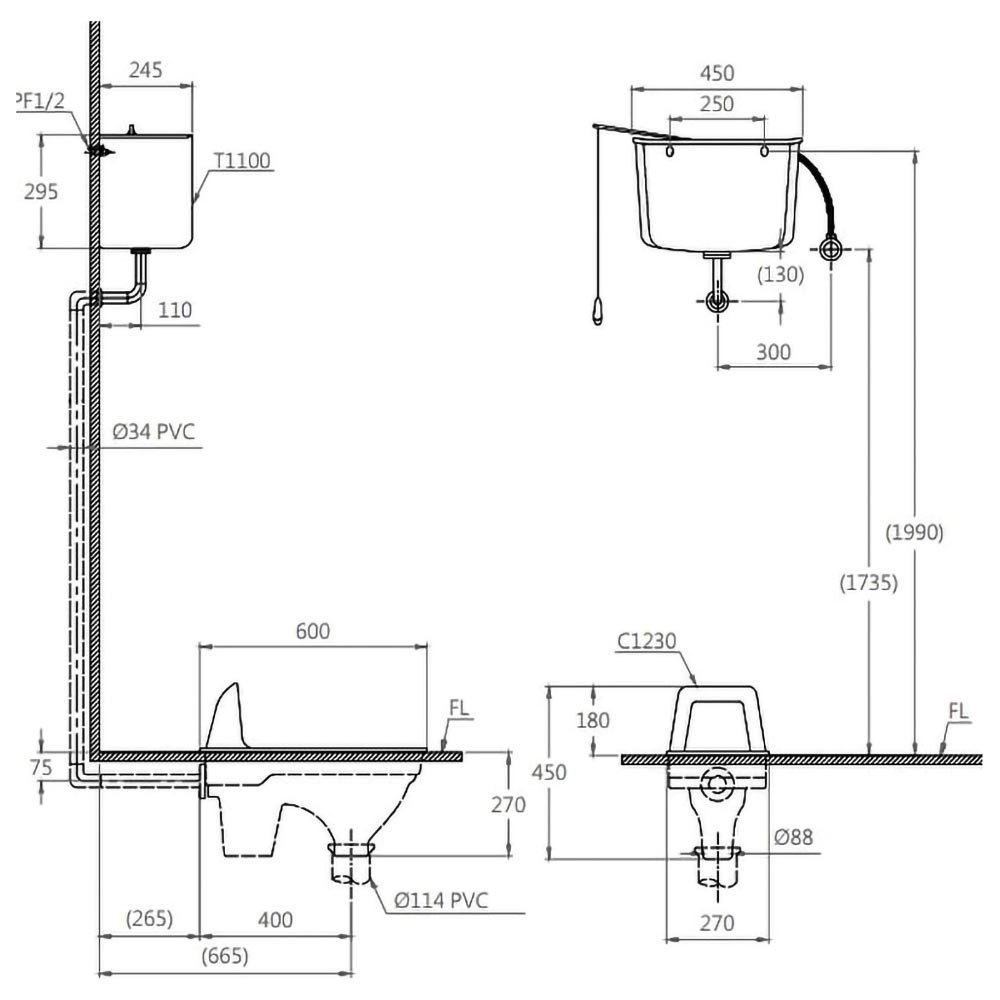 ♦ Tâm thoát: 695 mm