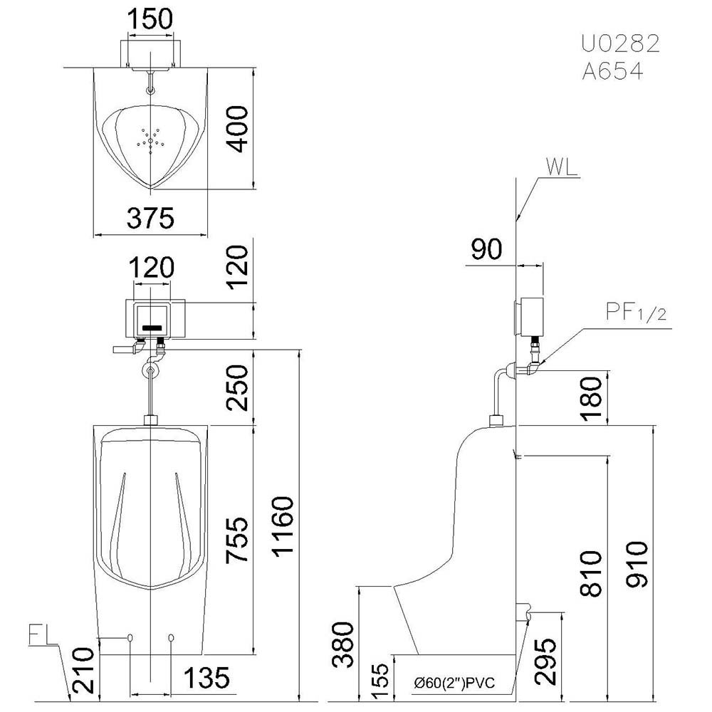 Về phương thức cấp thoát, U0282 theo cấu hình cấp nước trên, thoát ngang—điểm này quan trọng trong thi công thực tế. Nhiều công trình có sẵn lộ tuyến đường ống theo thiết kế, và việc bồn tiểu có hướng cấp/thoát tương thích sẽ giúp giảm rủi ro phải chỉnh sửa phức tạp, đồng thời hỗ trợ thi công trơn tru hơn. Bên cạnh đó, việc sản phẩm “không bao gồm van xả bồn tiểu” nhưng cho phép kết hợp các mã van cụ thể (A637, A648, A654, A673) giúp bạn chủ động nâng cấp hệ thống xả theo định hướng vận hành của công trình.