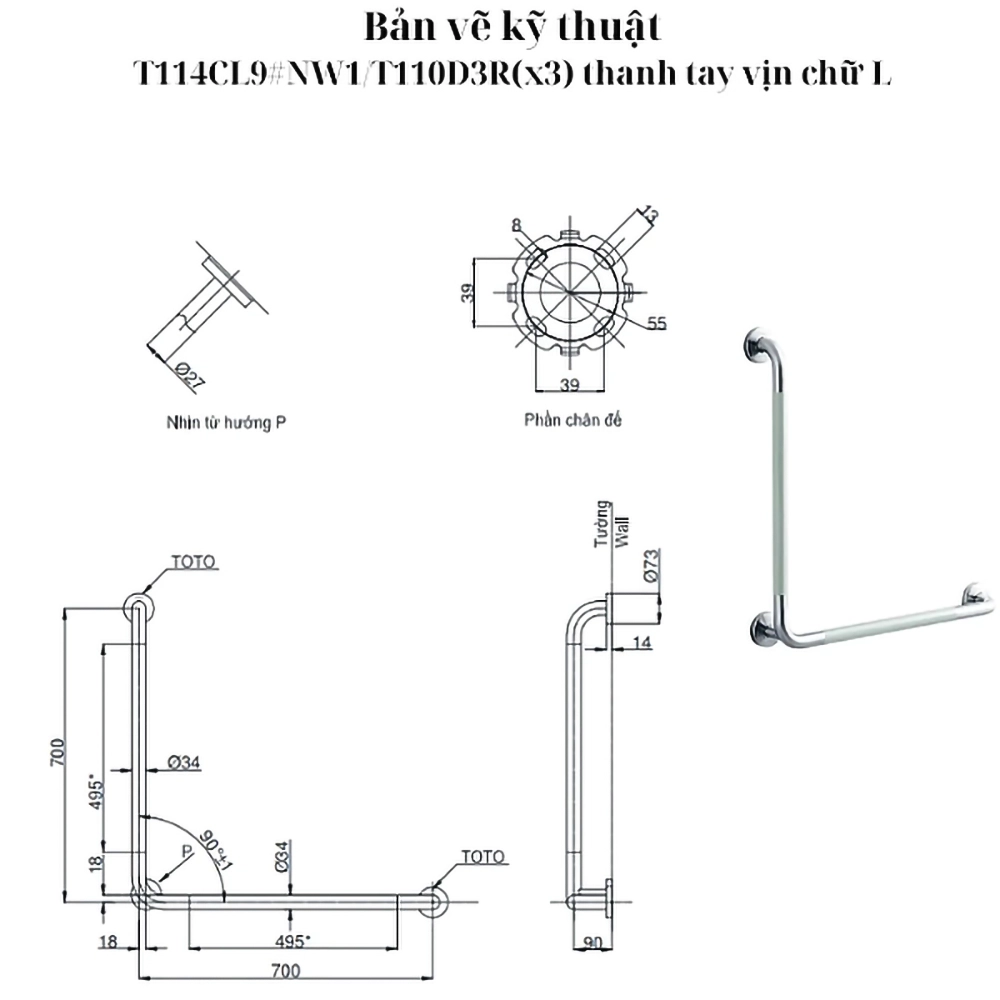 Thanh tay vịn TOTO T114CL9R#NW1/ T110D3R (x3) (dạng chữ L)
