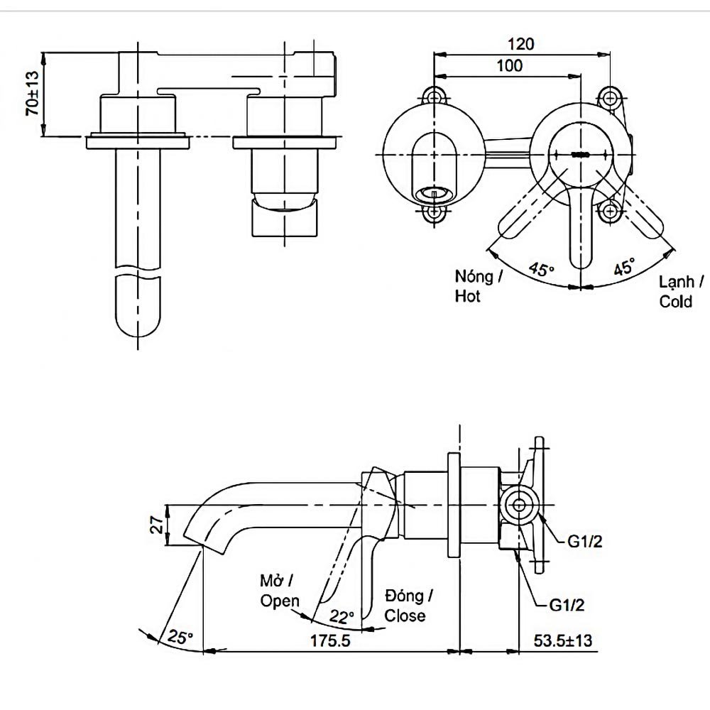 Vòi Lavabo TOTO TLS01310B nóng lạnh, gắn tường, dòng LB (2 lỗ)
