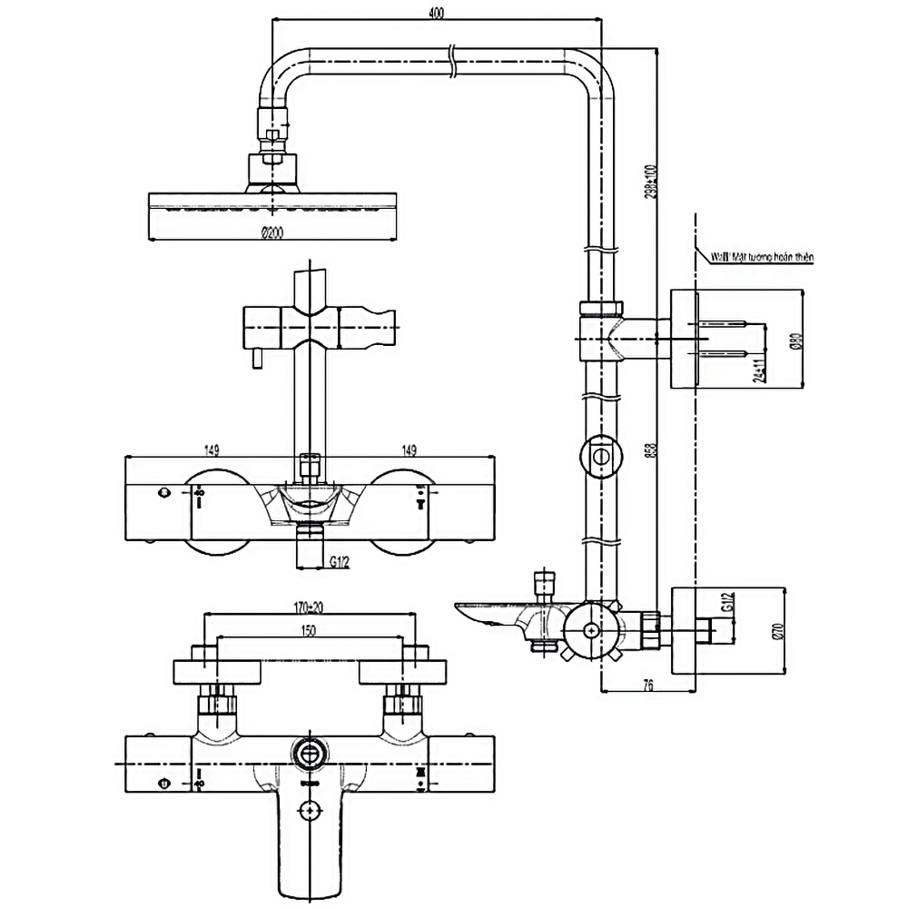 Vòi sen cây TOTO TBW01404BB (TBW01404B) nhiệt độ
