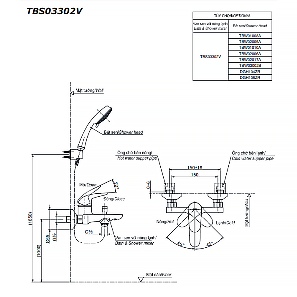 Vòi sen tắm TOTO TBS03302V/ TBW01010V nóng lạnh