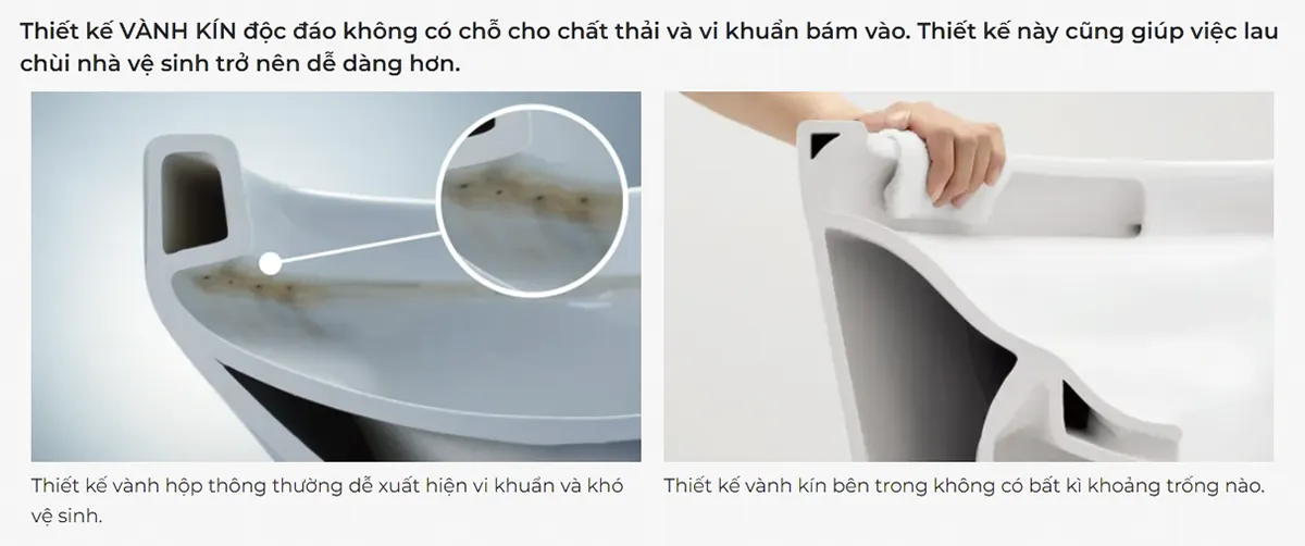 Sạch khuẩn tối đa: Các khe hở ở vành bồn cầu cũ là nơi lý tưởng để vi khuẩn, nấm mốc và mảng bám tích tụ. Với thiết kế vành kín, chất bẩn không còn nơi trú ngụ, giúp bảo vệ sức khỏe gia đình bạn.