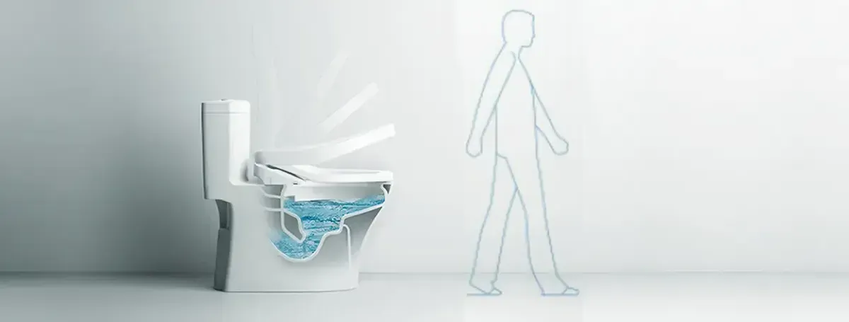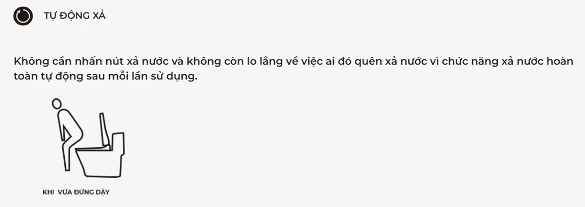 Tự động kích hoạt: Sau khi người dùng đứng dậy và rời đi, hệ thống sẽ tự động tính toán lượng nước cần thiết (xả đại hoặc xả tiểu) để cuốn trôi mọi vết bẩn mà không cần bất kỳ tác động vật lý nào vào nút nhấn hay tay gạt.